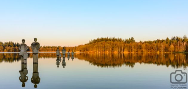 Twee jaar geleden was ik hier ook. Toen stand er een mooie ochtendmist over het water. Nu is het helder. De beeldengroep van Frans Goldhagen de #Ontmoeting blijven een surrealistisch beeld geven. Extra versterkt door dit vroege uur. Als ik van mijn bankje doorfiets, de hondenuitlaatster nog even laat schrikken op het moment dat ik zeg...inderdaad "niet schrikken", kom ik aan de overkant de beeldengroep tegen. Nu met zon mee op de bosrand aan andere oever. Hoe mooi is dat!
